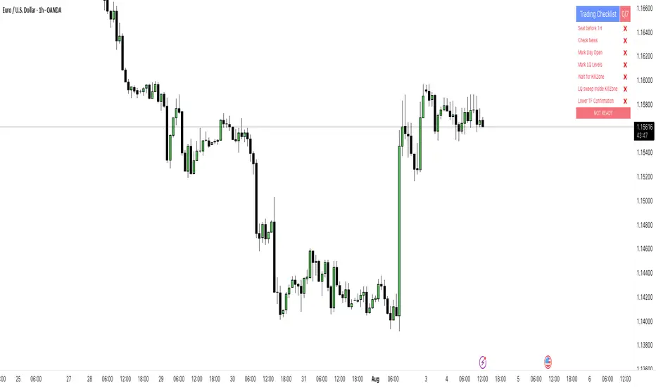 This is not an automated signal generator. It is a utility to keep you accountable to your own trading plan. The checklist items are inspired by common concepts in price action and Smart Money Concepts (SMC) methodologies, but they serve any trader who follows a rule-based system.