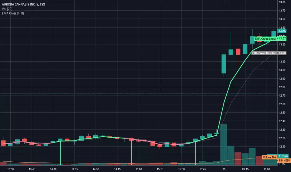 This script lets you setup 2 EMA time frames and color codes the short line (signal) based on if it is above or below the longer term line (baseline)