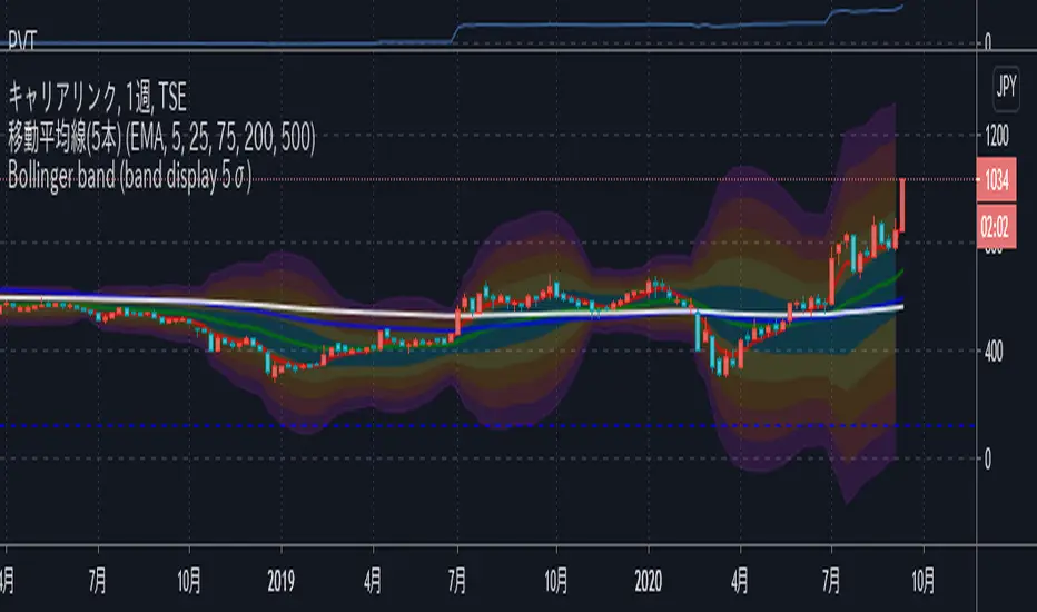 ボリンジャーバンドの帯域ごとに色を設定して表示します。