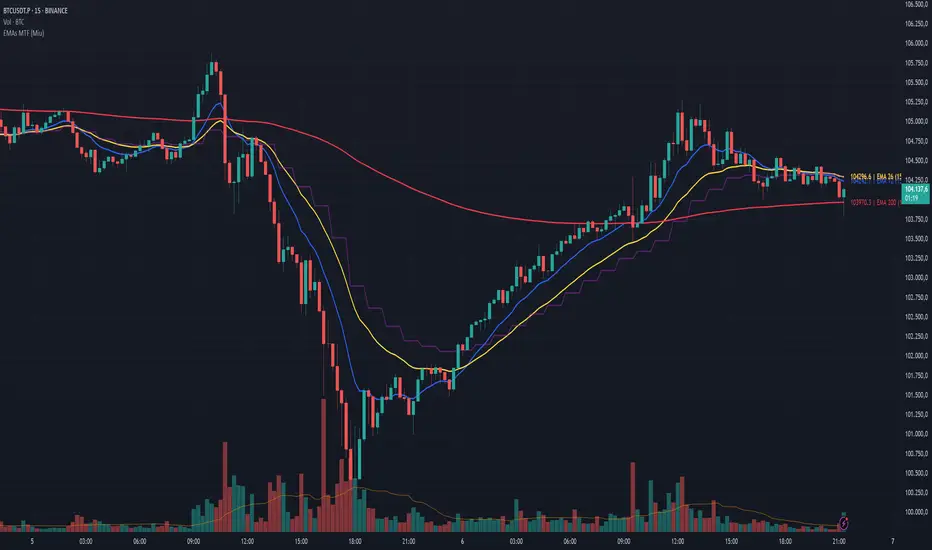 This indicator plots multiple EMA (Exponential Moving Average) on chart.