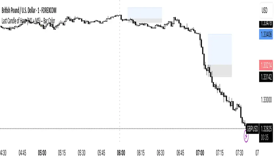 Highlights the last candle of every hour on 1-minute (M1) and 5-minute (M5) charts, making it easier to spot session closes, breakouts, and end-of-hour price action at a glance.