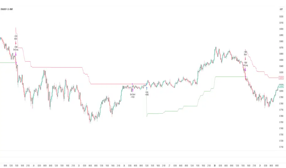 This strategy does not use any take-profit or classic trailing stop — the position is only closed when the trend reverses or the stop is hit by touching the SuperTrend line.