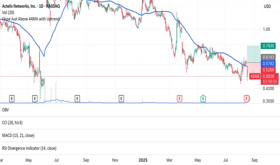 pine editor code for indicator to identify stocks whose price closes just above MA 44 with MA 44 trending up on a daily chart for swing trading