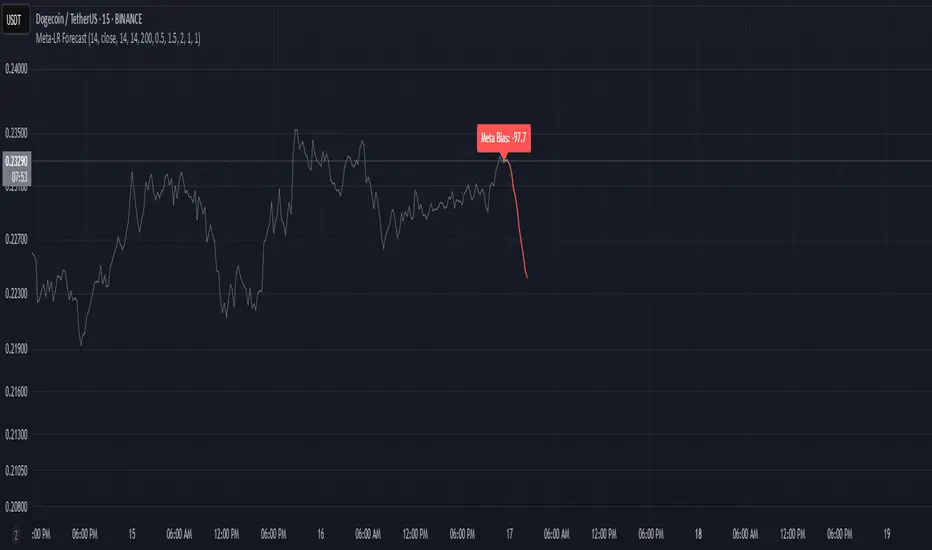 * Higher-timeframe updates. Values obtained via security for higher-timeframe series can update intrabar until the higher-timeframe bar closes. The forward path and Meta Bias% may change during formation of a higher-timeframe candle. If you need confirmed higher-timeframe inputs, consider reading the prior higher-timeframe value or acting only after the higher-timeframe close.