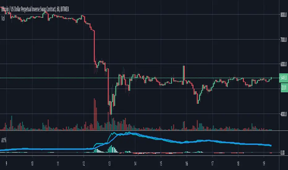 This indicator takes the standard ATR and expresses it as a percentage of the OHLC4 price. This has the advantage of normalising the ATR value across the history of an asset. For example, an ATR of value 20 when the price is 2000 actually has a very different meaning when the price rises to 4000. The ATR may be the same value but actually the volatility it represents has halved.