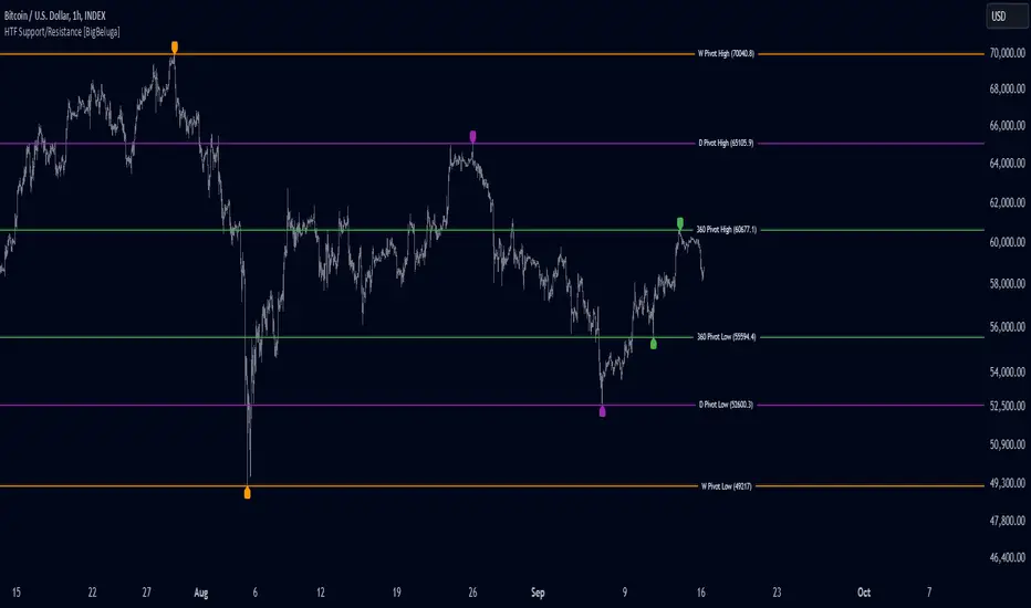 The indicator calculates pivot highs and lows from various higher timeframes (e.g., 4H, 1D, 1W) and plots these levels on the current chart. These pivot points are represented by horizontal lines that extend across the chart, serving as potential support and resistance zones. - Color-Coded Support and Resistance Lines: