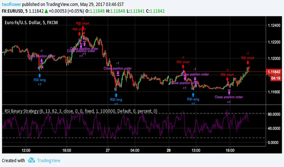 The rather specific values for the RSI bounds and length I saved have been developed for the EURUSD short term (5min.) interval, giving the highest amount of winning vs. loosing trades as of the publishing date of this script, which is the only important factor for binary options in my understanding. Use at your own risk.