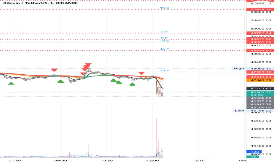 What's with the triangles? These are local tops/bottoms , candles that have a have decent size of the wick. These tops and bottoms are by no means "final", they are merely a rejection at certain levels of price. Due to markets complexities (and human erratic behaviors hehe) these levels could be breached at the very next candle. For a more "final" version (nothing is really final but..) I added Schaff Trend Cycle as filter, so a triangle will pop only when a trend is mature enough ( STC with a value near 0 or near 100).