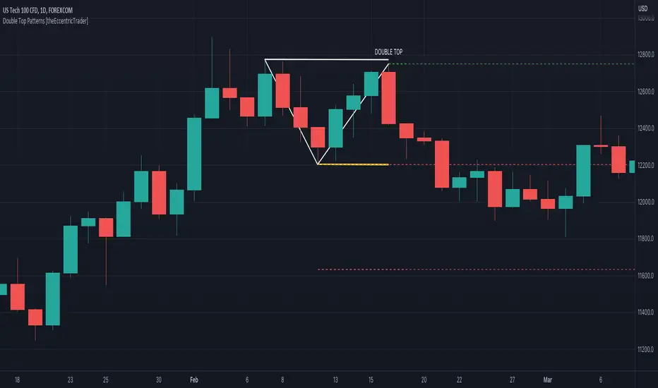 • Double top patterns are composed of one trough and two peaks, with the second peak being roughly equal to the first peak.