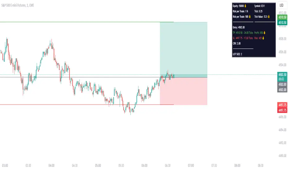 - Comprehensive Risk Evaluation: Beyond lot sizes, it provides you with the Cost-to-Reward Ratio (CRV) of your trade, the actual monetary risk according to the calculated lot size, and the potential profit.