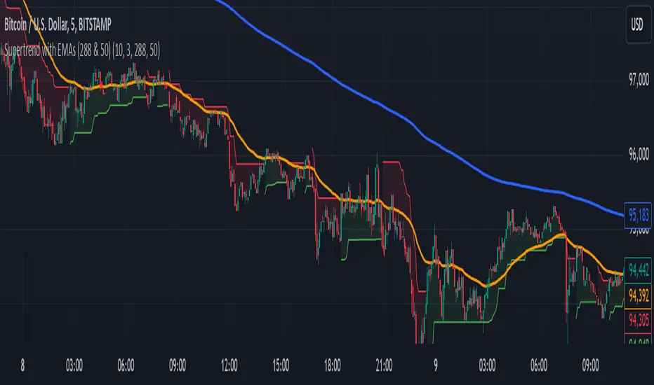 This indicator combines the Supertrend with two key Exponential Moving Averages (EMAs) — the 50 EMA and the 288 EMA — to help traders identify trends and possible entry or exit points in the market.