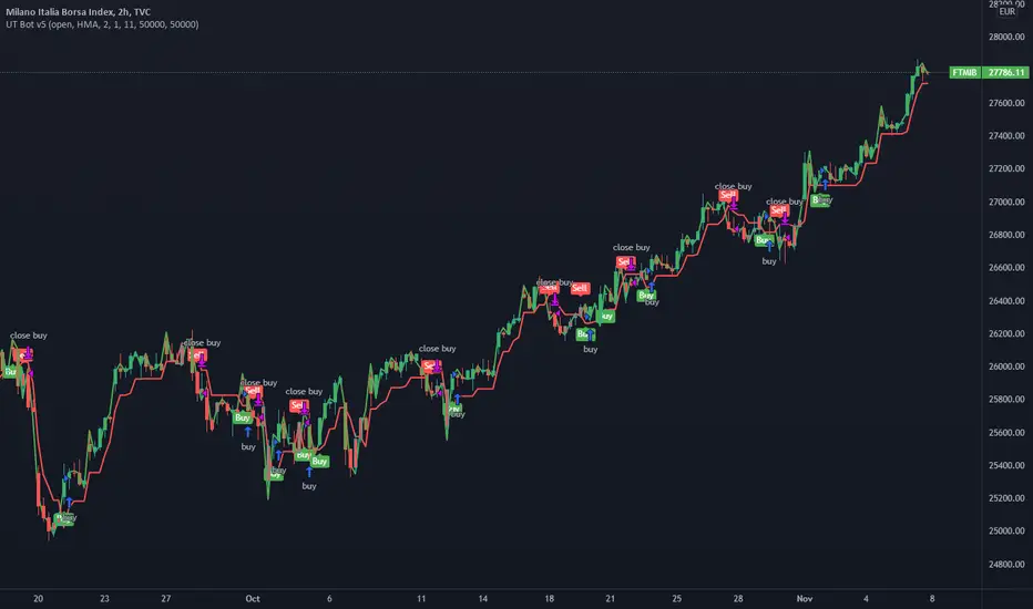 The UT Bot v5 is Movinging average (the MA) vs ATR (the ATR is in the form intended for use as trailing stop loss (ATR_TSL))