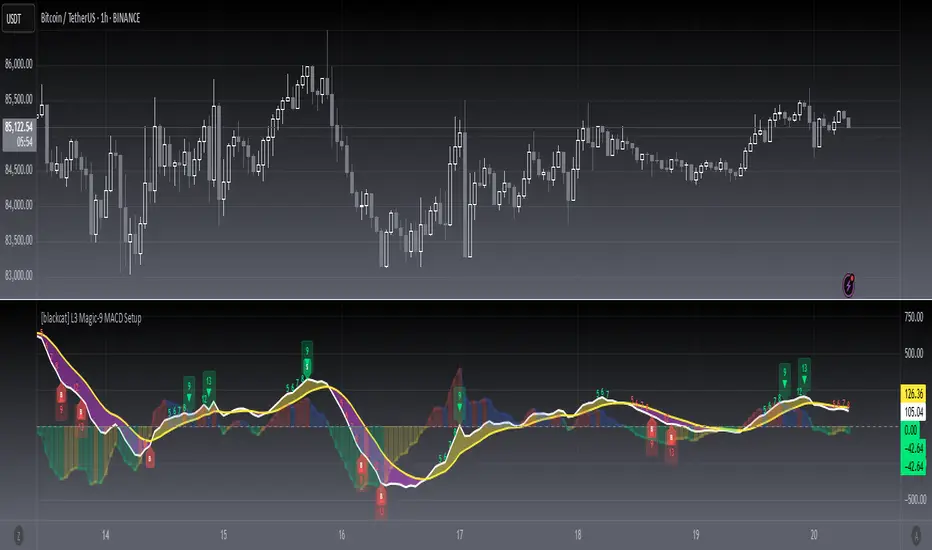 The [blackcat] L3 Magic-9 MACD Setup indicator is meticulously crafted to assist traders in identifying precise buy and sell signals through an enhanced Moving Average Convergence Divergence (MACD) methodology. This advanced tool integrates the Magic-9 Sequential technique to refine signal accuracy by filtering out market noise. By providing clear visual cues via labeled charts and real-time alerts, it empowers users to make informed trading decisions swiftly and confidently 📈✅.