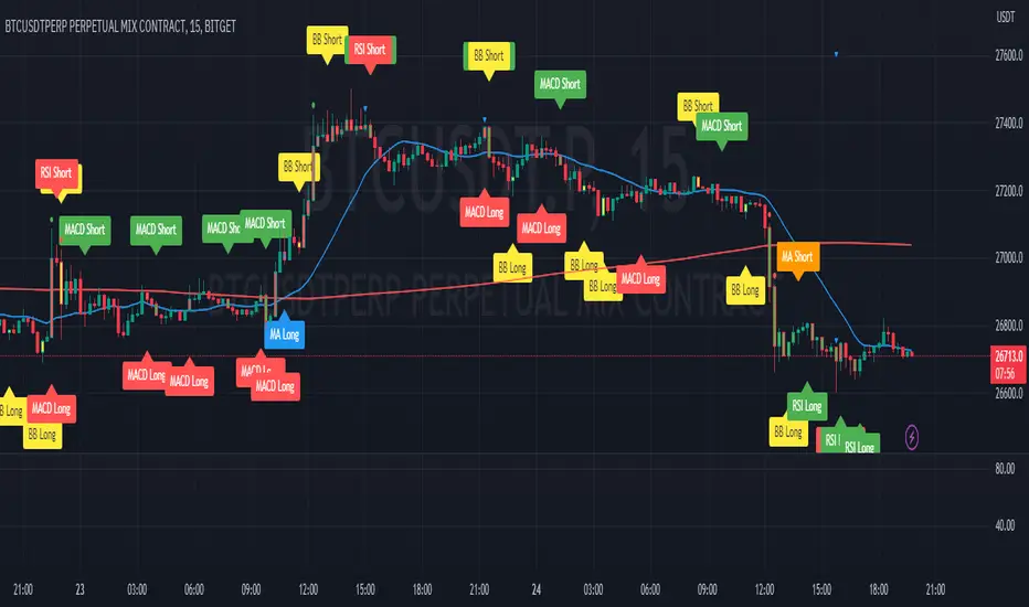 매수/매도 신호: 각 기술적 지표는 매수 또는 매도 신호를 생성합니다. 이러한 신호는 차트에 라벨로 표시됩니다. 우리의 전략에서는 RSI가 과매도 또는 과매수 영역을 벗어날 때, 이동평균이 교차할 때, 그리고 RSI 다이버전스가 발생할 때 매수/매도 신호를 생성합니다.