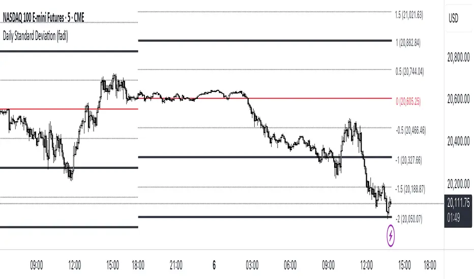 The Daily Standard Deviation indicator uses standard deviation to map out daily price movements. Standard deviation measures how much prices stray from their average—small values mean steady trends, large ones mean wild swings. Drawing from up to 20 years of data, it plots key levels using customizable Fibonacci lines tied to that standard deviation, giving traders a snapshot of typical price behavior.