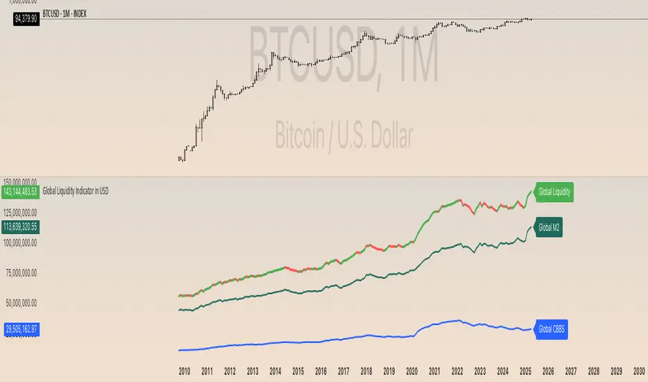 This indicator aggregates the total central bank balance sheets and M2 money supply for the USA, Canada, China, European Union, Japan, and the UK, converting all values to USD and normalizing them to trillions for easy visualization. It plots three lines: Total Balance Sheet, Total M2, and Combined Total, providing a comprehensive view of global liquidity trends.Key Features: