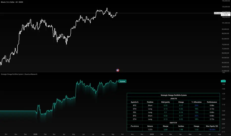 The Strategic Omega Portfolio System builds a rules-based multi-asset portfolio that adapts position and weight across up to five tickers (defaults: BTC, ETH, SOL, SUI + a spare slot).
