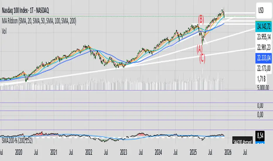 If, for example, closing prices around +25% above SMA200 were reached in the NDX, the probability is very high that the market has overreacted and an interim correction will follow – so the theory goes.