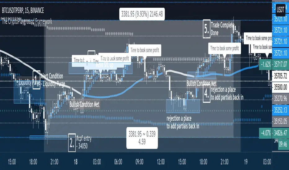 In this example, CryptoPlayground Framework has structured a trade example during a “Fakeout - Purge Event” to the sell side. Further visual description provided.