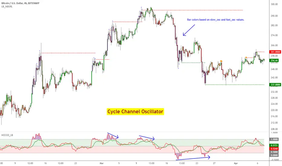There are 2 oscillator plots - fast & slow. Fast plot shows the price location with in the medium term channel, while slow plot shows the location of short term midline of cycle channel with respect to medium term channel.