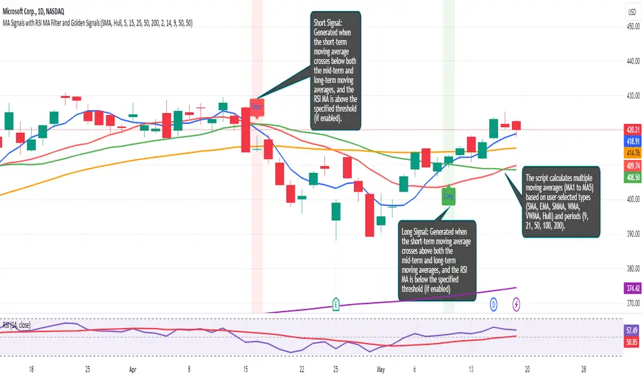The "Multiple Moving Averages Signals with RSI MA Filter and Golden Signals" script is a comprehensive trading tool designed to provide traders with detailed insights and actionable signals based on multiple moving averages and RSI (Relative Strength Index). This script combines traditional moving average crossovers with RSI filtering to enhance the accuracy of trading signals and includes "golden" signals to highlight significant long-term trend changes.