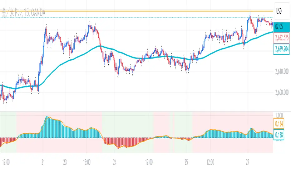 * Background coloring: The background color changes based on the oscillator's value to provide visual cues for buy or sell signals.