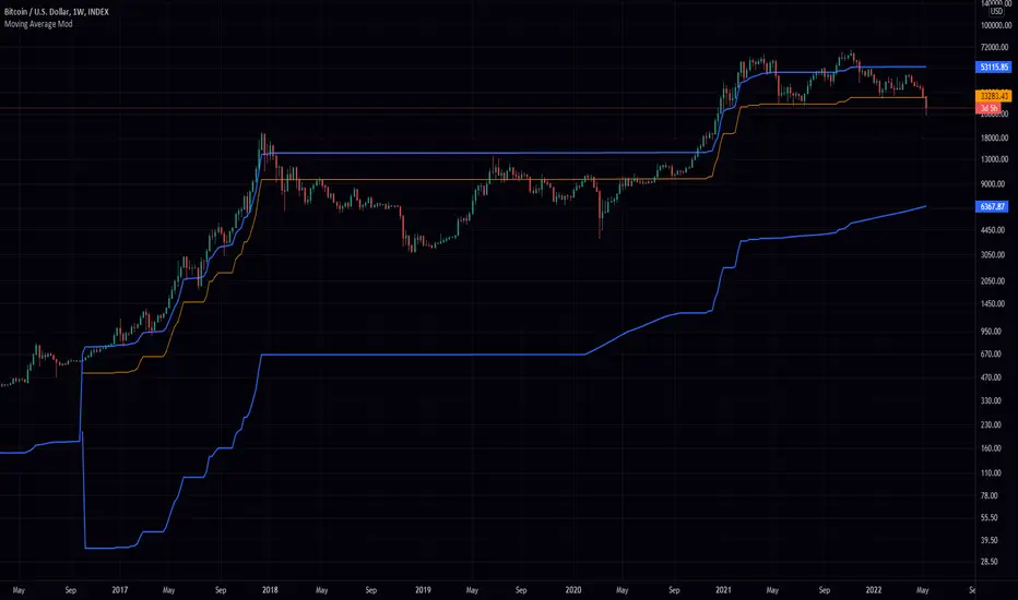 This moving average takes all of the moving averages between 1 and 700 and takes the average of them all. It also takes the min/max average (donchian) of every one of those averages. Also included is Bollinger Bands calculated in the same way. One nice feature I have added is the option to use geometric calculations for. I also added regular bb calculations because this can be a major hog. Use this default setting on 1d or 1w. Enjoy!