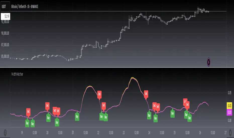 The [blackcat] Bollinger Bands Width Watcher is an advanced tool designed to monitor the width of Bollinger Bands, providing insights into market volatility and potential trend reversals. This indicator calculates both absolute and relative widths of the bands, plotting them on the chart for easy visualization. It also generates buy and sell signals based on crossover events, helping traders make informed decisions 📊✅.