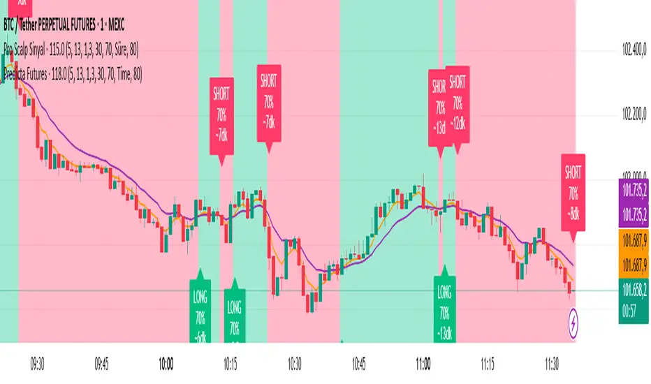Predicta Futures generates signals based on EMA crossovers and trend changes. It is ideal for 5-20x leveraged trades and short-term (5-9 min) positions.