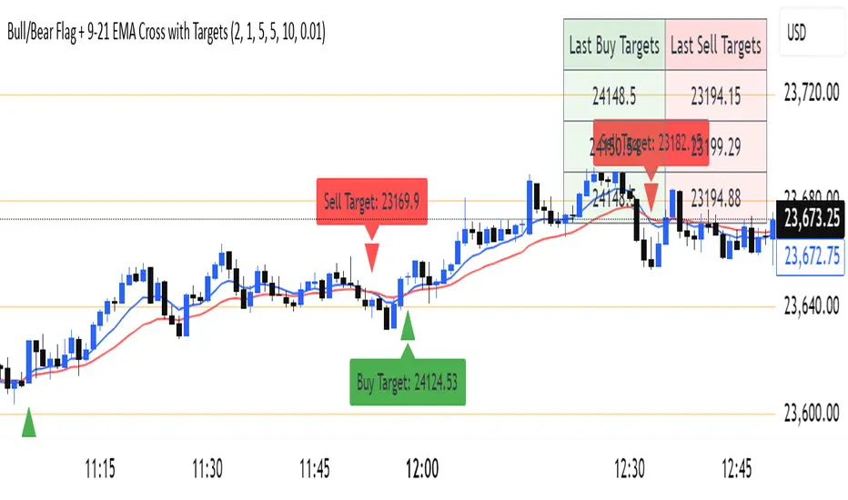 Bull/Bear Flag + 9-21 EMA Cross with Targets
