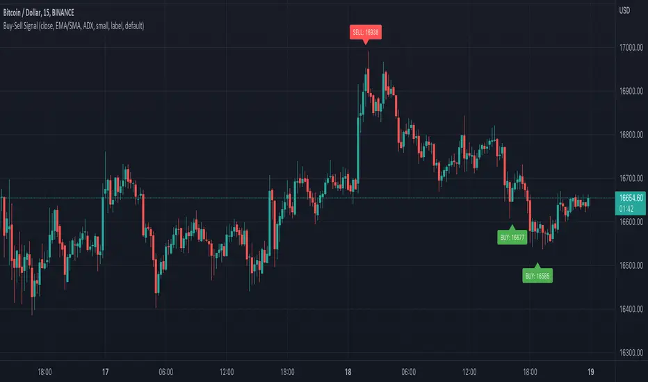 The indicator calculates the buy and sell signals using HLC3, Simple Moving Average ( SMA ) and the Exponential Moving Average ( EMA ) as soon as they cross. This indicator is useful with time intervals starting at 15m.