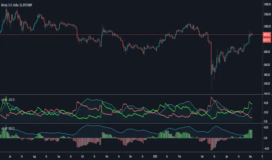 DI - Will show the direction of movement. This indicator includes two views of the DI. the DI+ and DI- crossover and a histogram of the spread between the two.