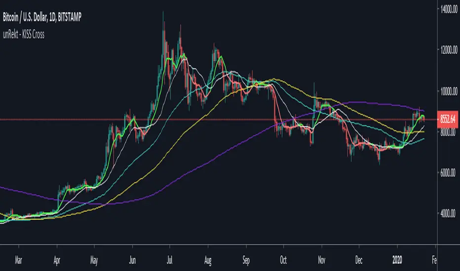 KISS Cross is a moving average crossover and is part of the ''keeping it simple' series that have a similar color scheme. With this indicator you can select the moving average you'd like to use either SMA, EMA, WMA, or VWMA. Each moving average can be turned on or off and input changed. The first two MA's will change color on the cross from green to red depending on cross up or a cross down.