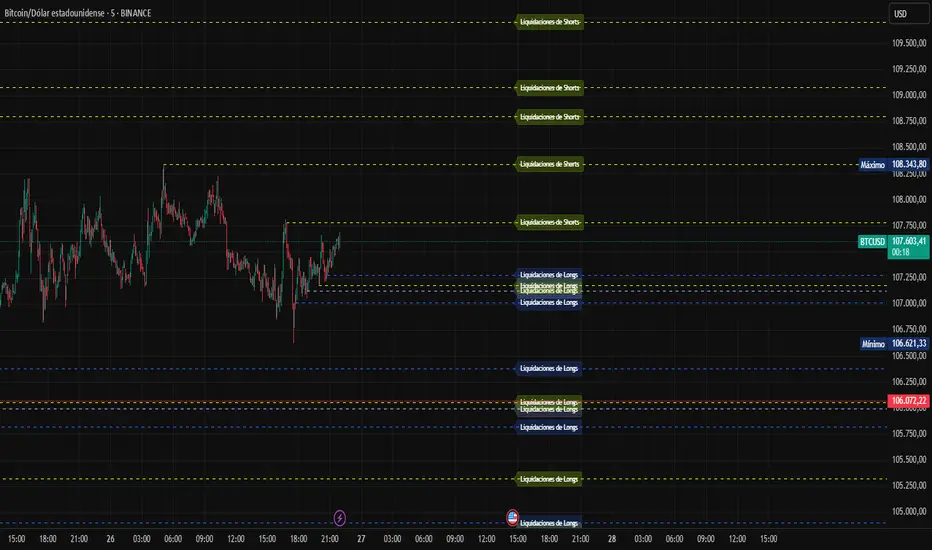 Each liquidity line is colored according to the strength of the detected liquidation event, making it easy to visually assess the potential significance of the price level. Lines extend to the right, serving as ongoing reference points. When the price interacts with a liquidity line (i.e., "touches" it), the line and its corresponding label are removed, indicating that the liquidity at that level may have been absorbed.