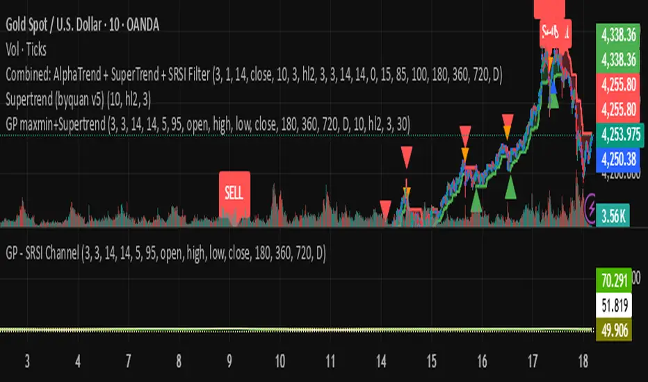 The GP – SRSI Channel is a momentum-based oscillator that measures the relative strength of price movements across multiple timeframes using the Stochastic RSI (SRSI) method.
