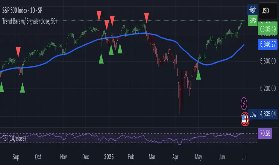Trend Bars with Signals: Visualize the Trend, Simplify Your TradingTired of cluttered charts and confusing signals? Trend Bars with Signals is a powerful yet intuitive all-in-one indicator designed to give you an instant, crystal-clear view of market trends. By coloring the price bars based on their position relative to a key moving average, this tool helps you cut through the noise and focus on what matters most: the direction of the trend.