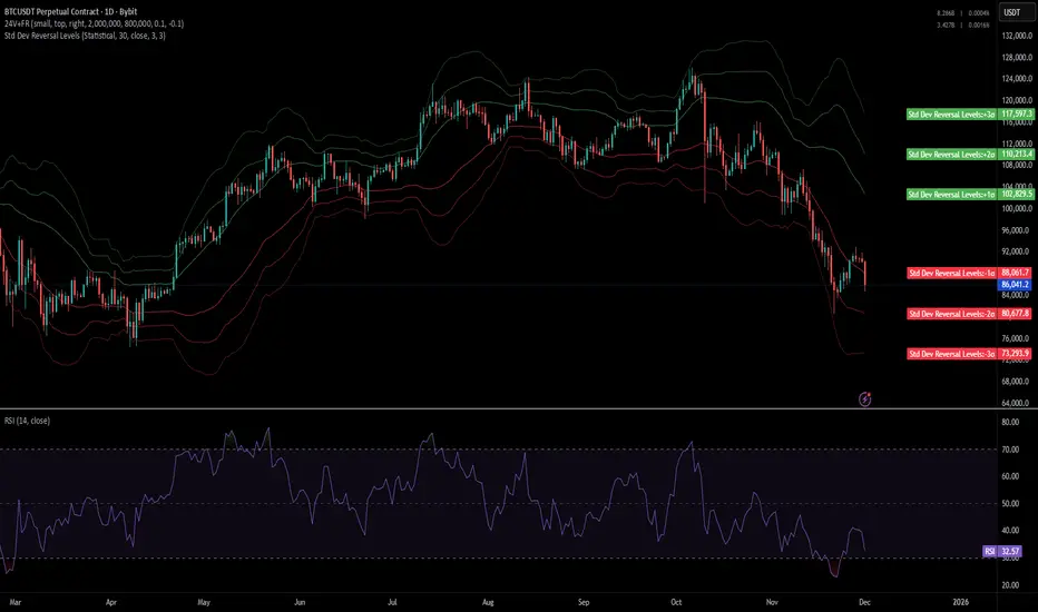 Plots standard deviation bands around a central mean to identify statistically extreme price levels where reversals are likely.How It Works