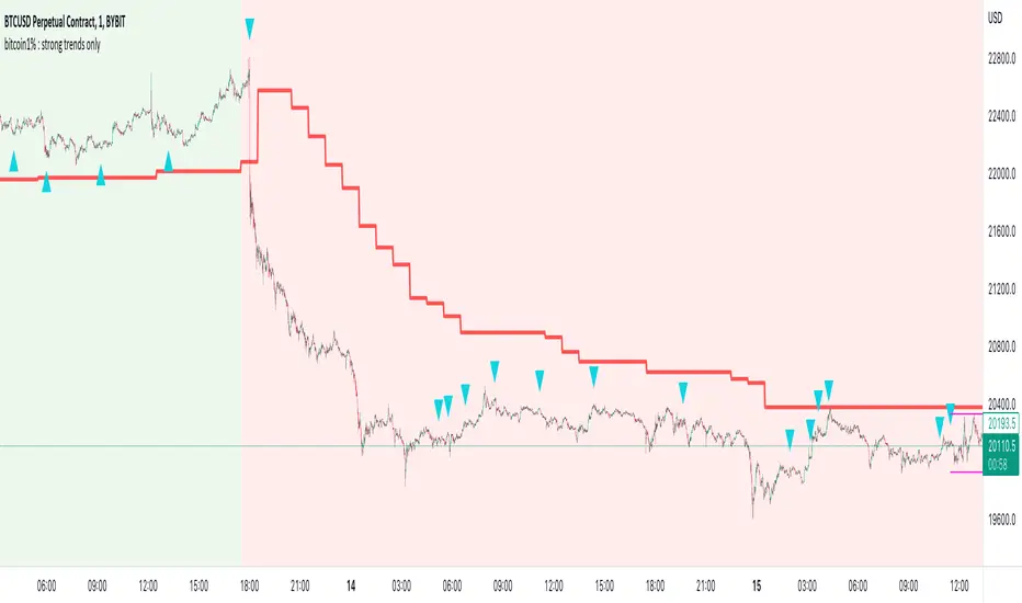 Trading Mindset: When Bitcoin1% indicates a long trade, it basically says "BTC is more likely to move up 1% than go down 1% form here" : The script only indicates direction of the next 1% which is all you need for High Leverage Trading. You can set target & stop at 1% & try different variations with experience.