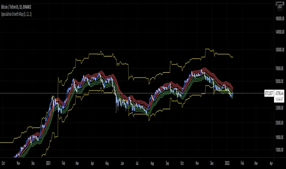 The Speculative Growth Map, SGM, aims to show investors whether they are buying into the hype or actually getting a good deal on their purchase. This indicator works by working out the growth of the asset divided into eight major sections and two extreme scenarios. The first four lines, indicated by red. show that if the market enters into that area you should not be purchasing any more assets for that market as the market has entered into optimized growth. The next four lines, in green, indicate that you should be looking into purchasing the asset as it has entered a dip or a pullback. Next up, the yellow lines, indicate an extreme growth or extreme pullbacks. If the market comes close to either of these, it indicates major price action is about to occur.