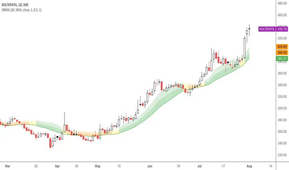 The Dual Bollinger moving average (DBMA) consists of a moving average (MA) & two Bollinger Bands (BB), with the color of the bands representing the level of price compression. In its default settings, it is a 20-day simple moving average with 2 upper Bollinger Bands, having the standard deviation (SD) settings of 0.5 & 1, respectively.