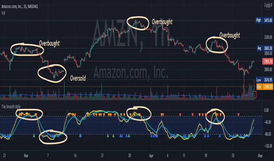This indicator adds two additional EMA lines to the original Williams %R indicator. Default EMA lengths are 5 and 13. The result is 2 smoother average lines, which are easier to read.
