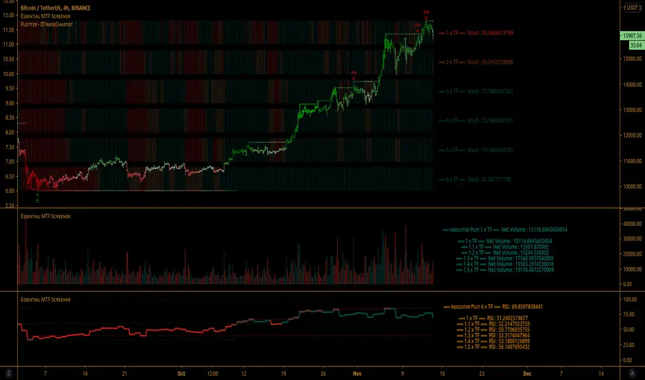 ™TradeChartist Essential MTF Screener is an adaptive and powerful multi time frame screener toolkit for several essential trading indicators like RSI, Stochastic, CCI, MACD, 15 different Moving Averages, Heikin Ashi Trend and Net Volume, which can be visualised as a singular Indicator plot or as MTF Screener blocks showing absolute or trend-based colour coded Bull/Bear Strength along with real-time indicator value labels.