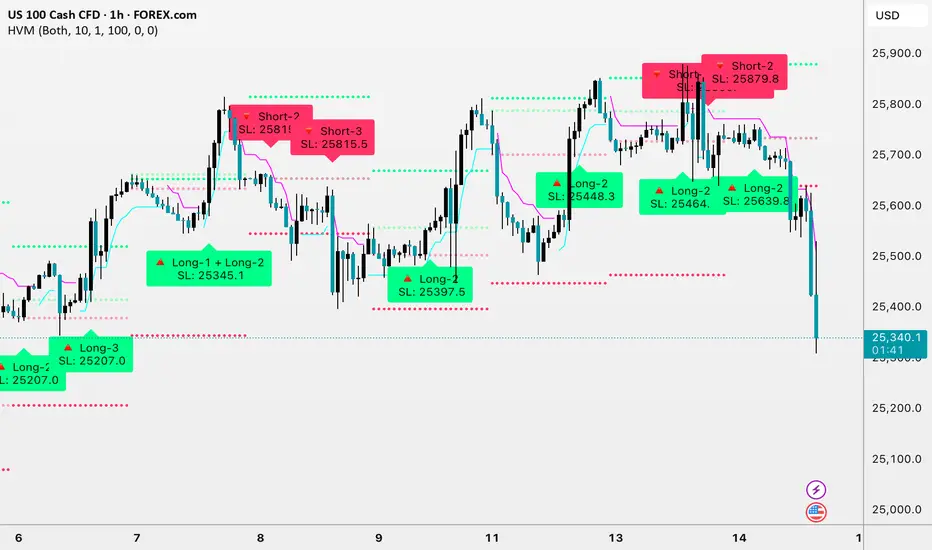 HVM (Hybrid Volatility Model) is a session-aware trading indicator that merges Opening Range market structure with a continuous ATR-based volatility trend engine.