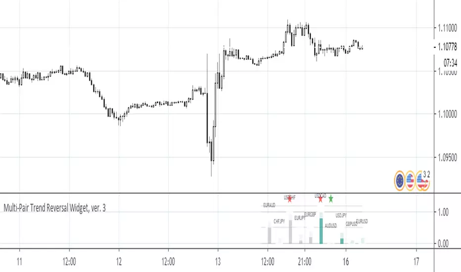 This is a multi-currency-pair trend reversal widget, which picks currency pairs by overbought/oversold level and can be used in pair trading strategy. It shows tradable currency pairs as well as anticipates corresponding trend direction. Currency pairs (CPs) are ordered by importance. The first 5 CPs are highlighted (with blue bars) as majors. The additional 5 CPs are minors (in gray bars) and may be omitted. Orange star indicates crossover of the middle line, the mean, with red and green stars being early warning signals of a forthcoming uptrend and downtrend, correspondingly.
