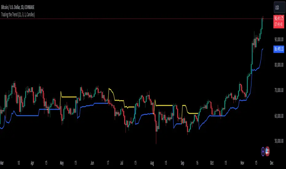 The Trading the Trend indicator, developed by Andrew Abraham, combines volatility and trend-following principles to identify market direction. It uses a 21-period weighted average of the True Range (ATR) to measure volatility and define uptrends and downtrends.