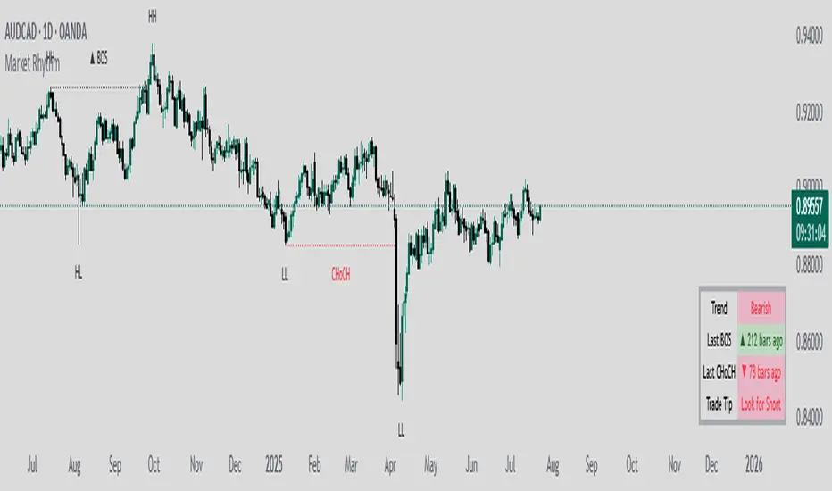 If you’re a price-action enthusiast who loves to stay on top of structural shifts in the market, Market Rhythm is here to supercharge your charting experience! This script automatically identifies swing points (HH, LH, HL, LL), detects breaks of structure (BOS), flags changes of character (CHoCH), and offers an optional Trade Tip to guide your next move. It also provides a sleek table summarizing the latest signals so you can confirm momentum or pivot-based ideas at a glance.