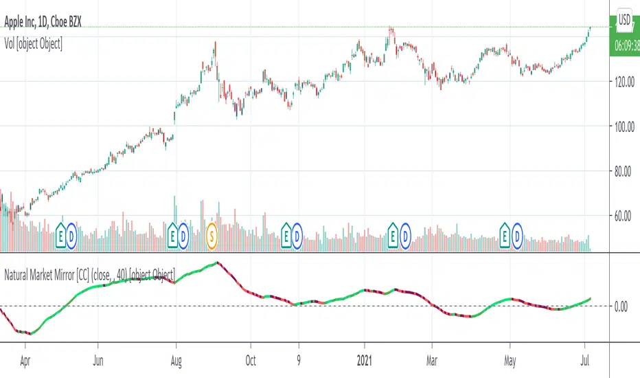 The Natural Market Mirror was created by Jim Sloman (Ocean Theory pgs 49-57) and this is a continuation of my series from Jim Sloman's indicators. This indicator is also a momentum indicator and is very similar to the previous indicator I published, the Ocean Indicator and of course this indicator is built using ideas from the Ocean indicator. It may just be my opinion but I feel like this indicator provides better buy and sell signals in comparison. I built this using strong buy and sell indicators in addition to normal ones so darker colors are the strong signals and lighter colors are the normal signals. Buy when the line turns green and sell when it turns red.