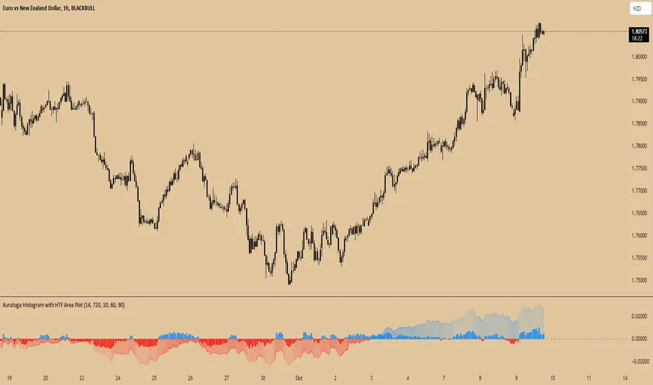 The Kurutoga Histogram is a versatile and visually intuitive tool for measuring price divergence from a key equilibrium point, helping traders to assess the strength of trends and identify potential reversal points. Its use across multiple timeframes provides deeper insights, making it a valuable addition to any trading strategy that emphasizes momentum and trend following.