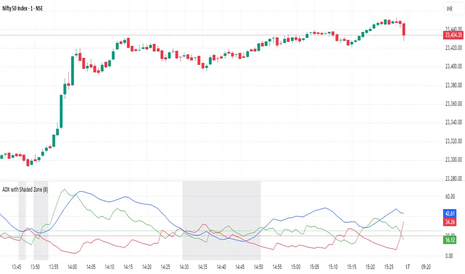 The ADX with Shaded Zone indicator is a momentum-based tool that visualizes trend strength using the Average Directional Index (ADX) along with the +DI and -DI lines. This indicator enhances the traditional ADX setup by adding a shaded zone between ADX levels 20 and 25, helping traders easily identify the transition area between non-trending and trending market conditions.