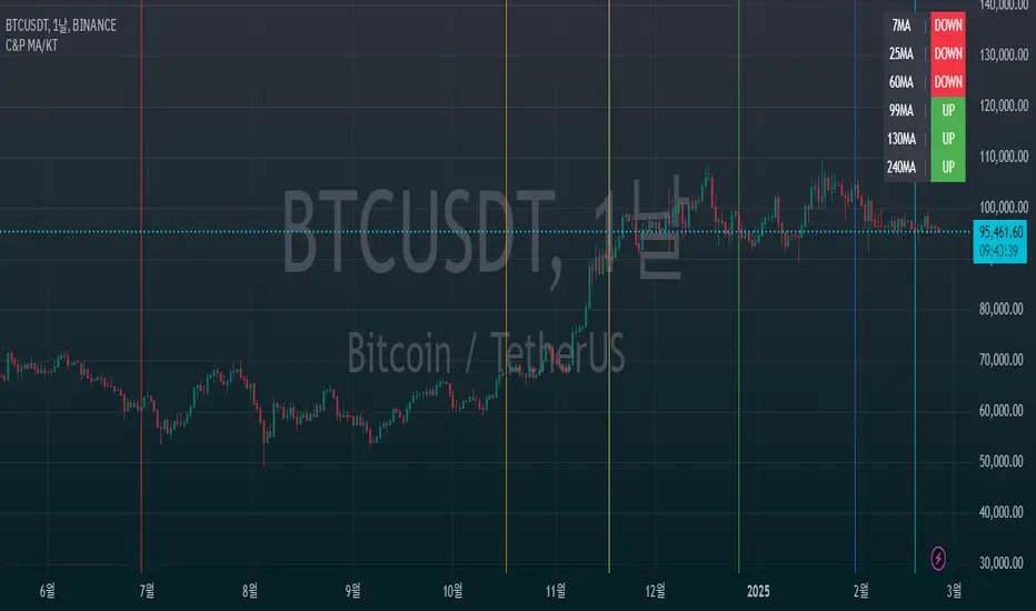 지표에 수직선 기능을 추가했습니다. 수직선은 현 캔들과 비교되는 과거의 캔들을 표시해주며, 이를 통해 MA 방향의 예측에, 추세 예측에 더 도움을 줄 수 있습니다. 수직선이 표시되는게 마음에 들지 않으신다면 설정에서 끌 수 있습니다.